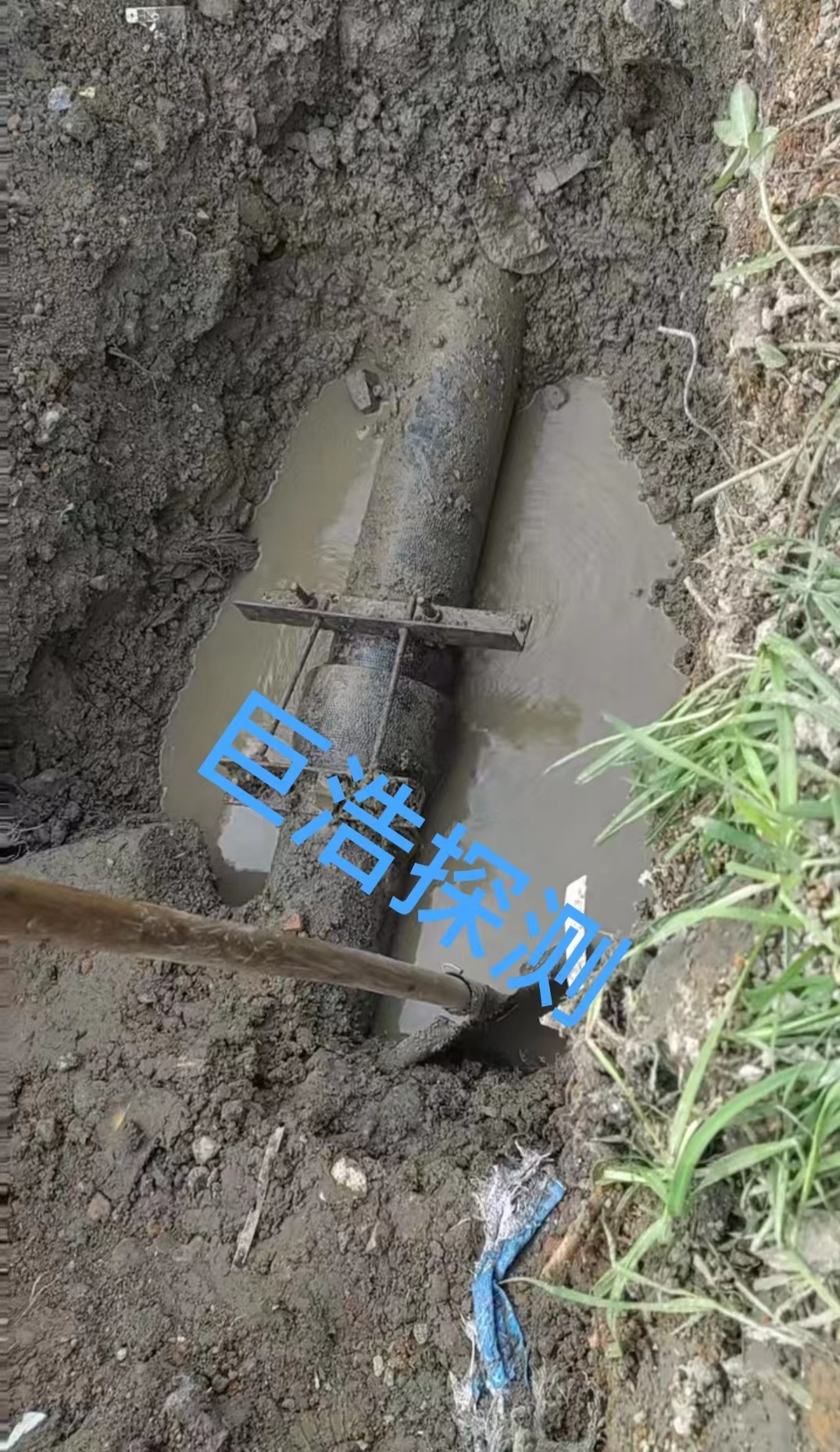 随后在开展漏水检测工作中多人使用仪器确定管网具体位置开始检测漏水点,通过普查方式来缩小漏水范围找到疑似漏水区域,最后确定管道漏水位置,在通过对漏水点的开挖,验证,漏水点定位精准,其漏水原为承插口接口漏水,管道为DN200球磨铸铁管道,埋深在1.5左右。下图
