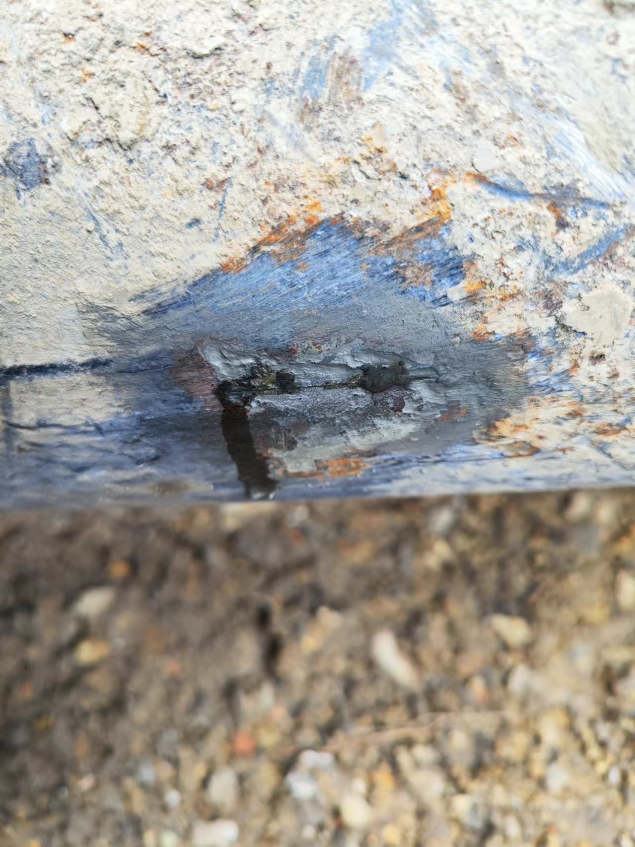 但是漏口周围好多锈蚀将漏口覆盖,导致漏孔并未见迸射的泄漏水线,从漏孔流出的水是从管道侧面的泄漏口缓慢流淌到管道底部后渗流到地下。